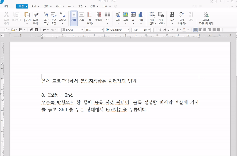 오른쪽 방향으로 한 행이 블록 지정됩니다.. 블록 설정할 마지막 부분에 커서를 놓고 Shift를 누른 상태에서 End키를 누릅니다.