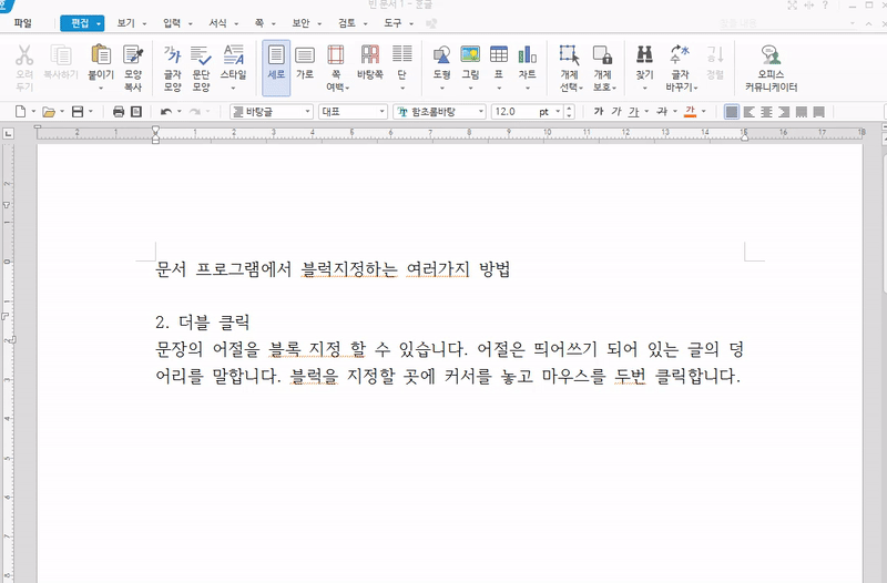 문장 전체를 블록 지정할 수 있습니다. 블록을 지정할 문장에 커서를 놓고 마우스를 세 번 클릭합니다. 문장은 엔터를 치기 전까지의 영역이 블록 설정됩니다.
